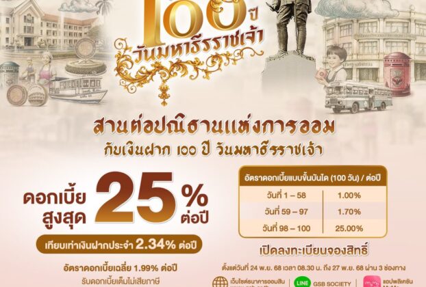 ออมสิน ออกเงินฝากส่งเสริมการออม น้อมรำลึกในพระมหากรุณาธิคุณ รัชกาลที่ 6 “เงินฝาก 100 ปี วันมหาธีรราชเจ้า” ฝาก 100 วัน ดอกเบี้ย Step up สูงสุด 25% ต่อปี จองสิทธิ์ 24 พ.ย. นี้