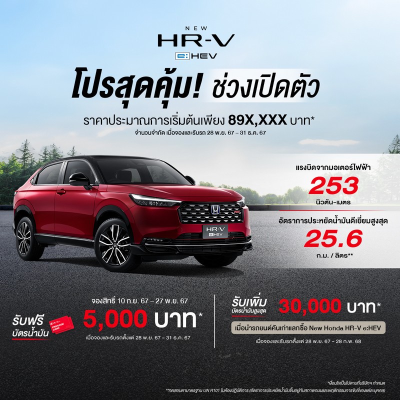 บริษัท ฮอนด้า ออโตโมบิล (ประเทศไทย) จำกัด ขอบคุณความเชื่อมั่นจากลูกค้าที่มีต่อ ฮอนด้า เอชอาร์-วี อี:เอชอีวี ใหม่ รุ่นไมเนอร์เชนจ์ ด้วยยอดจองสิทธิ์กว่า 3,000 คัน ตั้งแต่ 10 กันยายน 2567 – 21 ตุลาคม 2567 ตอกย้ำความเป็นรถ SUV ฟูลไฮบริดยอดนิยมจากฮอนด้าในใจลูกค้าชาวไทย ทั้งนี้ ฮอนด้า มุ่งหวังที่จะขยายฐานลูกค้าไปหลากหลายกลุ่มให้มากขึ้น ครั้งนี้ ฮอนด้า เอชอาร์-วี อี:เอชอีวี ใหม่ จึงมาพร้อมราคาแนะนำใหม่ เพื่อให้เป็นเจ้าของได้ง่ายขึ้น โดยหลังจากที่ได้ประกาศราคาประมาณการไปเมื่อวันที่ 3 ตุลาคม 2567 ที่ผ่านมา มีลูกค้าให้ความสนใจลงทะเบียนจองสิทธิ์ ในการเป็นเจ้าของเพิ่มขึ้นอย่างต่อเนื่อง