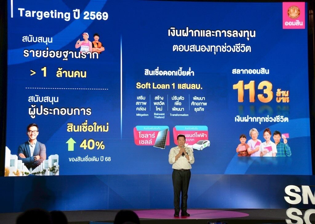 สำหรับทิศทางการดำเนินงานในปี 2569 ธนาคารออมสิน ตั้งเป้าหมายสนับสนุนประชาชนฐานรากได้มากกว่า 1 ล้านคน เพิ่มสัดส่วนสินเชื่อใหม่แก่ผู้ประกอบการมากกว่าร้อยละ 40 ของสินเชื่อรวมในปี 2568 พร้อมเดินหน้าพัฒนาผลิตภัณฑ์ทางการเงินที่ตอบโจทย์ทุกช่วงชีวิต อาทิ สินเชื่อดอกเบี้ยต่ำ (Soft Loan) ที่สนับสนุนการใช้พลังงานทดแทน ทั้งที่เป็นการกู้ติดตั้งระบบโซลาร์เซลล์และกู้เพื่อซื้อยานยนต์ไฟฟ้า การเปิดจำหน่ายสลากออมสินพิเศษในโอกาสครบรอบก่อตั้งธนาคาร 113 ปี รวมถึงผลิตภัณฑ์เงินฝากที่มีสิทธิประโยชน์ เช่น เงินฝากแบบมีประกันชีวิต/ประกันสุขภาพ เพื่อส่งเสริมการออมและสร้างความมั่นคงทางการเงินให้คนไทยในทุกมิติ