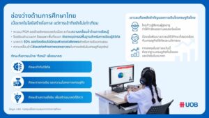 ยูโอบี ประเทศไทย จึงพัฒนาแนวทางสนับสนุนเยาวชนอย่างเป็นระบบ โดยมุ่งสร้างความมั่นคง และความพร้อมตั้งแต่ระดับพื้นฐานการเรียนรู้ ไปจนถึงการส่งเสริมศักยภาพในการขับเคลื่อนอนาคตที่ยั่งยืน วางรากฐานความพร้อมทางการเรียนรู้ ผ่านโครงการห้องเรียนดิจิทัล UOB My Digital Space (MDS) โดยธนาคารร่วมมือกับโครงการร้อยพลังการศึกษา มูลนิธิยุวพัฒน์ ในการยกระดับโครงสร้างพื้นฐานดิจิทัลในพื้นที่ขาดโอกาส ควบคู่กับการพัฒนาทักษะ ด้านคณิตศาสตร์ วิทยาศาสตร์ และภาษาอังกฤษ พร้อมอบรมครูให้สามารถบูรณาการเทคโนโลยี เข้าสู่กระบวนการเรียนการสอนได้อย่างต่อเนื่อง