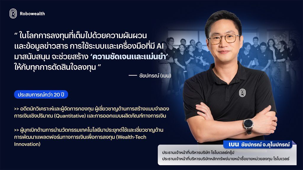 ขณะเดียวกัน กลุ่มบริษัทฯ ยังแสดงศักยภาพความแข็งแกร่งผ่านการทำงานร่วมกันของทีมบริหารผู้เชี่ยวชาญ โดย คุณสิฏ์ระสา บุญ-หลง (กรรมการผู้จัดการฝ่าย Strategic Wealth Alliance, บลน. โรโบเวลธ์) มุ่งพัฒนาเครื่องมือ “IIC Portal” เพื่อเป็นผู้ช่วยอัจฉริยะสำหรับที่ปรึกษาการลงทุนอิสระและตัวแทนประกัน ในการวางแผนการเงินแบบองค์รวม และ คุณกมลวรรณ สุชาตานนท์ (ประธานเจ้าหน้าที่บริหาร บลป. โรโบเวลธ์) ที่ดูแลด้านงานวิจัยและบริการ Private Wealth Management โดยยึดเป้าหมายนักลงทุนเป็นหัวใจสำคัญ ทั้งนี้ ความสำเร็จสะท้อนผ่านอัตราการเติบโตของรายได้ บลน. โรโบเวลธ์ ที่สูงถึง 107% ต่อปี และความเชื่อมั่นจาก Beacon VC (ในเครือธนาคารกสิกรไทย) ที่เข้ามาร่วมถือหุ้นใหญ่ในสัดส่วน 53% ภายใต้การกำกับดูแลด้านการเงินที่เข้มงวดโดย คุณศรุดา พัฒนาหิรัญ (ประธานเจ้าหน้าที่บริหารฝ่ายการเงินกลุ่มบริษัทโรโบเวลธ์)