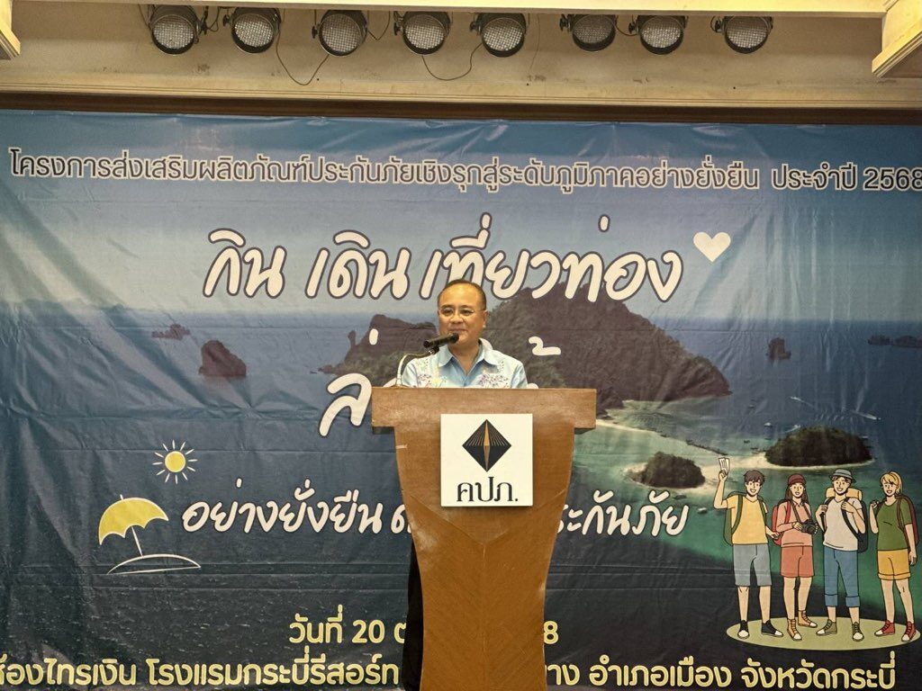 เลขาธิการ คปภ. กล่าวว่า จังหวัดกระบี่เป็นหนึ่งในจังหวัดท่องเที่ยวหลักของประเทศ มีรายได้จากการท่องเที่ยวสูงเป็นอันดับต้น ๆ จากข้อมูลตั้งแต่เดือนมกราคม – กันยายน 2568 จังหวัดกระบี่มีรายได้จากการท่องเที่ยวกว่า 77,917 ล้านบาท จากนักท่องเที่ยวทั้งชาวไทยและต่างชาติ รวมกว่า 4.7 ล้านคน สะท้อนถึงศักยภาพและแนวโน้มการเติบโตของภาคการท่องเที่ยวอย่างต่อเนื่อง แต่ความเติบโตดังกล่าวก็มีความเสี่ยงจากภัยธรรมชาติ เช่น น้ำท่วม ดินถล่ม และอุบัติเหตุจากการเดินทาง ทั้งอุบัติเหตุทางรถยนต์ อุบัติเหตุจากการใช้บริการสถานที่ท่องเที่ยว ที่พัก ร้านอาหาร รวมถึงอุบัติเหตุทางน้ำและทางเรือ ซึ่งจังหวัดกระบี่เป็นจังหวัดที่มีจำนวนเที่ยวเรือโดยสารมากที่สุดในประเทศถึง 204,179 เที่ยวต่อปี และนักท่องเที่ยวใช้บริการเรือ จำนวน 4,226,913 คนต่อปี