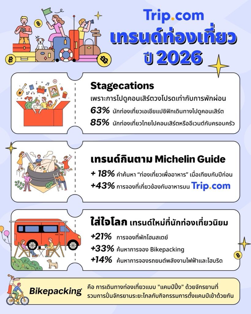 • “Stagecations” กำลังได้รับความนิยมในกลุ่มครอบครัว: Stagecation หรือการการท่องเที่ยวเพื่อชมความบันเทิงสดกำลังได้รับความนิยมเพิ่มขึ้น ปัจจุบันนักเดินทางในภูมิภาคเอเชียแปซิฟิกกว่า 63% เดินทางเพื่อชมคอนเสิร์ตหรือ่วมงานอีเวนต์ ขณะที่นักท่องเที่ยวชาวไทยถึง 85% มักผสมผสานทริปคอนเสิร์ตหรือเทศกาลเข้ากับการท่องเที่ยวพักผ่อนของครอบครัว โดยมีเมืองศูนย์กลางยอดนิยมอย่างมาเก๊า ลาสเวกัส เมลเบิร์น และสิงคโปร์เป็นจุดหมายหลัก